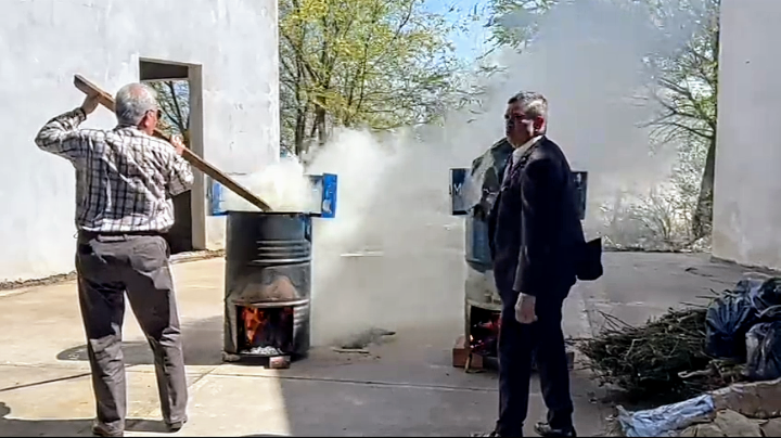 El mediodía de este viernes, con la supervisión de los bomberos voluntarios de «El Fortín», las autoridades de la Justicia Federal de Villa Mercedes quemaron unos 90 kilos y unas 120 plantas de marihuana, como parte de la destrucción de estupefacientes secuestrados en procedimientos policiales, que realizan cada tanto. En la actividad que, seguramente cambió la atmósfera del lugar y el tufillo del aire, participó hasta la máxima autoridad de la sede que el fuero federal tiene en la ciudad, el juez Juan Carlos Nacul. En numerosos videos difundidos se lo puede ver cómo con sus propias manos coloca las parvas de largas ramas de las plantas de cannabis sativa, dentro de un par de grandes tachos, para incinerarlas. Y hasta se observa al magistrado empujar enérgicamente las plantas hacia el interior de uno de los enormes recipientes, para que el fuego las quemara en su totalidad.