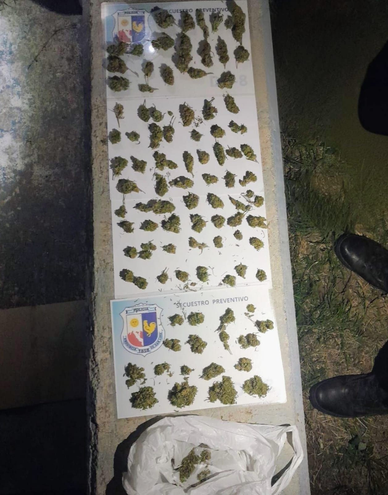 Siguiendo los rastros de una investigación, los policías interceptaron un automóvil Ford Fiesta en el que circulaban tres hombres y una mujer. Luego de la requisa, incautaron y secuestraron envoltorios de nylon con florescencias de marihuana, suficiente para la elaboración de 174 dosis, valuadas en $610.000. También un arma de fuego tipo pistolón antiguo.