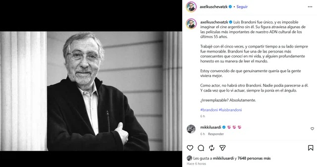 Por otra parte, el productor Axel Kuschevatzky emocionó a sus seguidores con una sentida dedicatoria para Brandoni, destacando su forma de ver el mundo.