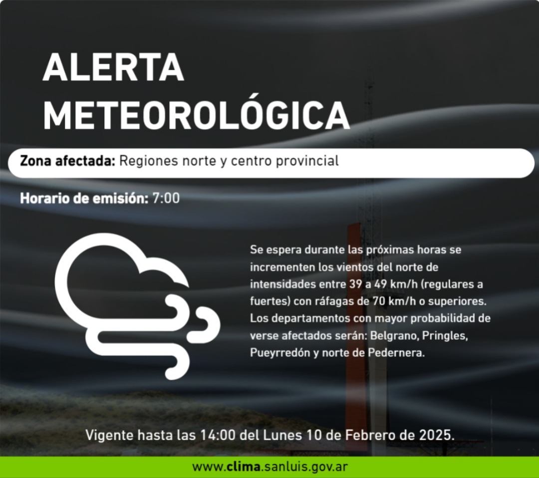 La alerta es para el norte y centro de la provincia, especialmente para los departamentos Belgrano, Pringles, Pueyrredón y el norte de Pedernera.