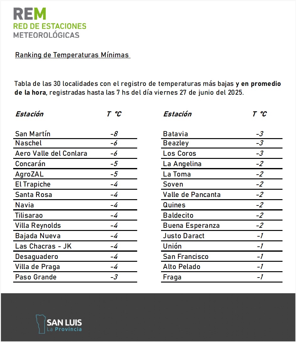 Por quinto día consecutivo, San Luis amaneció este viernes con 30 localidades que registraron temperaturas mínimas bajo cero. Entre el lunes y hoy el termómetro tuvo picos de entre −10 y −8 grados, en promedio de acuerdo al ranking de frío publicado por la Red de Estaciones Meteorológicas (REM) a diario.