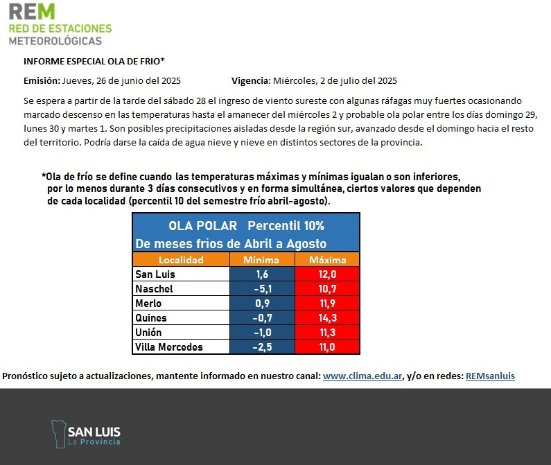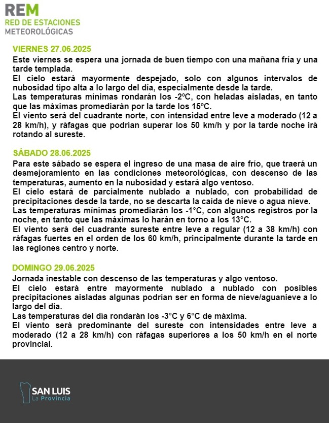 El clima que viene seguirá haciendo tiritar a los sanluiseños. La REM emitió un informe especial en el que advierte sobre una nueva ola polar, lluvias y nieve en la provincia. Este sábado por la tarde ingresará viento sureste con ráfagas fuertes que harán bajar la temperatura hasta el miércoles al amanecer.