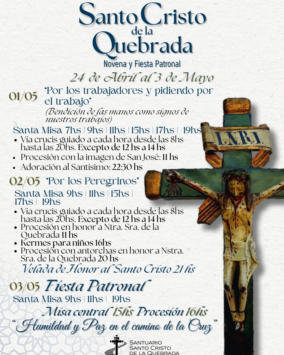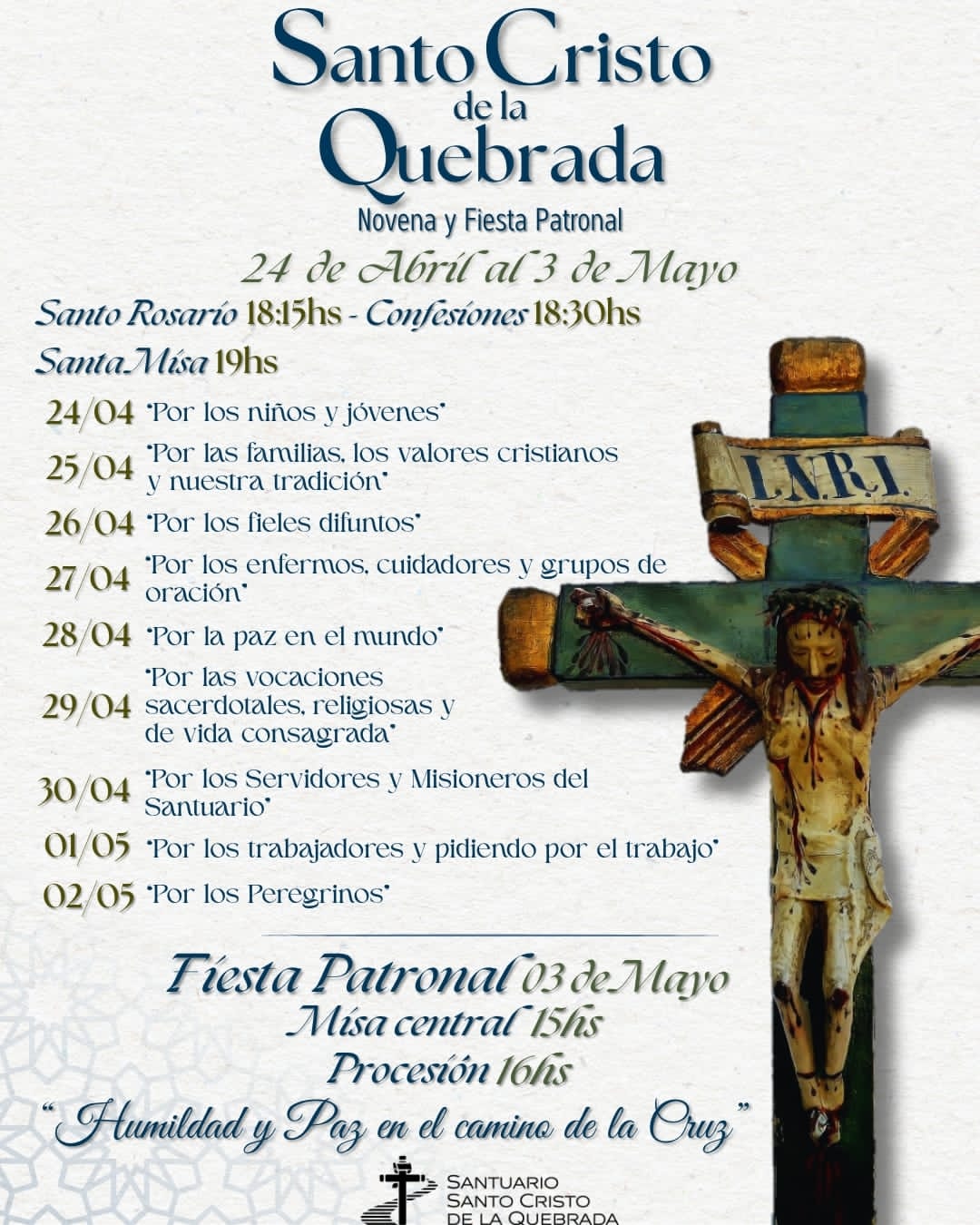 En Villa de la Quebrada, las actividades se desarrollarán hasta el 3 de mayo con el rezo del Santo Rosario a las 18:15, confesiones a las 18:30 y la Santa Misa a las 19:00. Cada jornada estará dedicada a distintas intenciones, como los niños y jóvenes, las familias, los enfermos, los trabajadores y los peregrinos.
