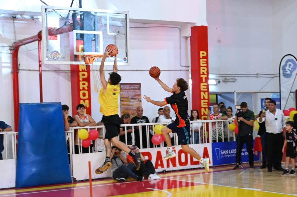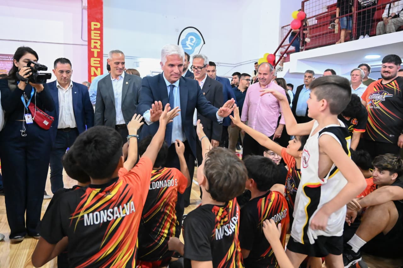 Por la tarde, el gobernador Claudio Poggi concurrió al Club San Martín de Villa Mercedes para la presentación. Allí lo recibieron directivos, coordinadores, profesores, jugadores, padres y allegados a la institución para celebrar la renovación del suelo de la cancha de básquet, cestoball y voley.