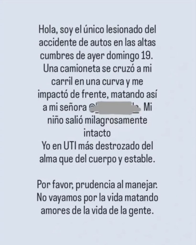 Tras la tragedia vial en altas cumbres del pasado domingo, en el que cuatro personas perdieron la vida, en las últimas horas se conoció el conmovedor mensaje del conductor de uno los autos involucrados, quien junto a su hijo de sólo 1 año fueron los únicos sobrevivientes del terrible accidente.
