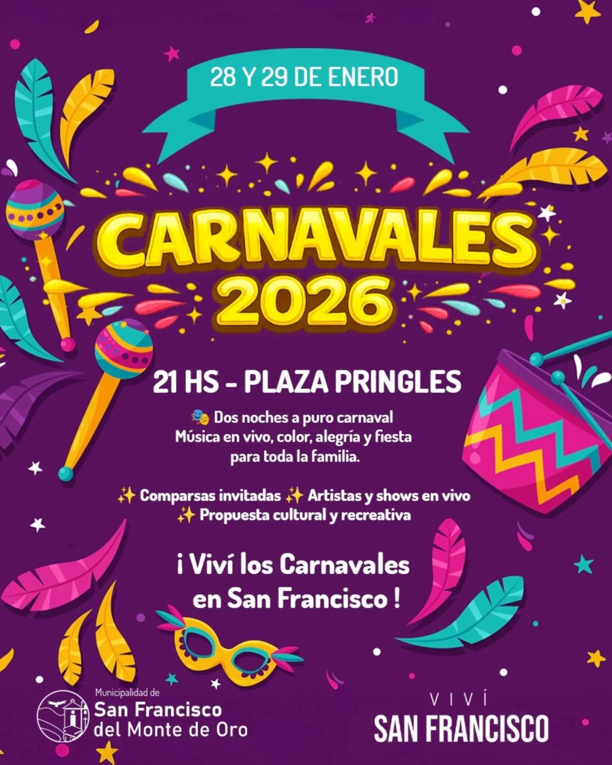San Francisco del Monte de Oro se prepara para convertirse en uno de los principales polos de atracción turística y cultural de la provincia con una agenda de cuatro días consecutivos de celebraciones populares. Del 28 al 31 de enero, vecinos y visitantes podrán disfrutar del Carnaval 2026 y del Festival Provincial del Gaucho, dos eventos que ya son parte del calendario cultural sanluiseño y convocan a públicos de todas las edades.