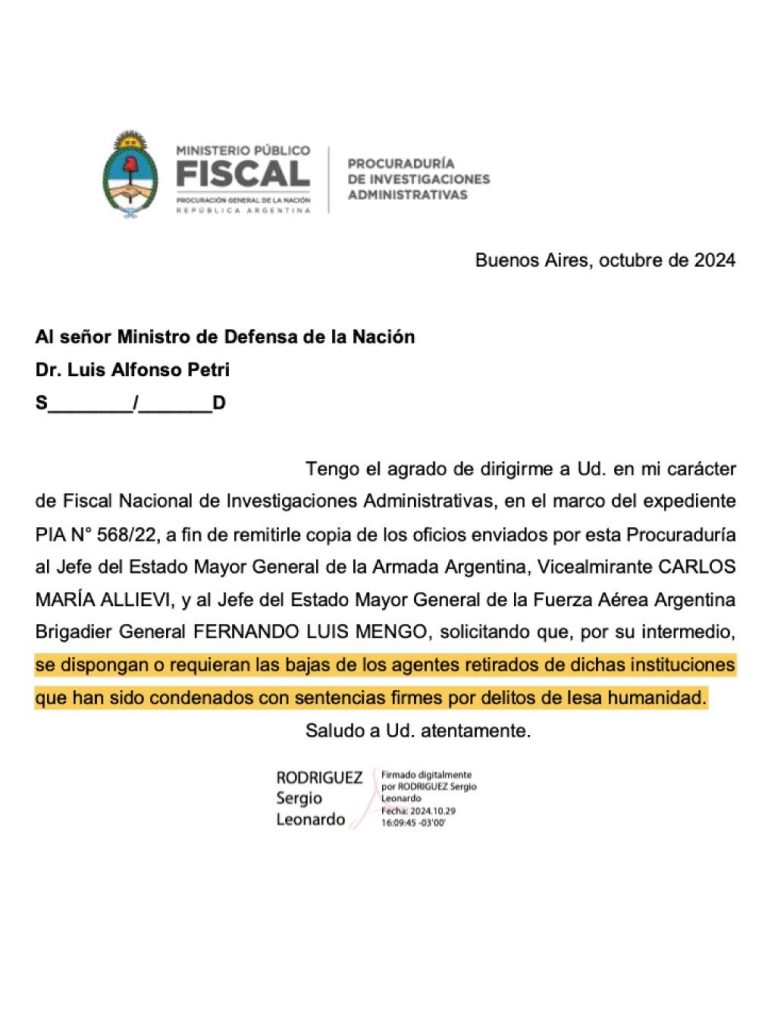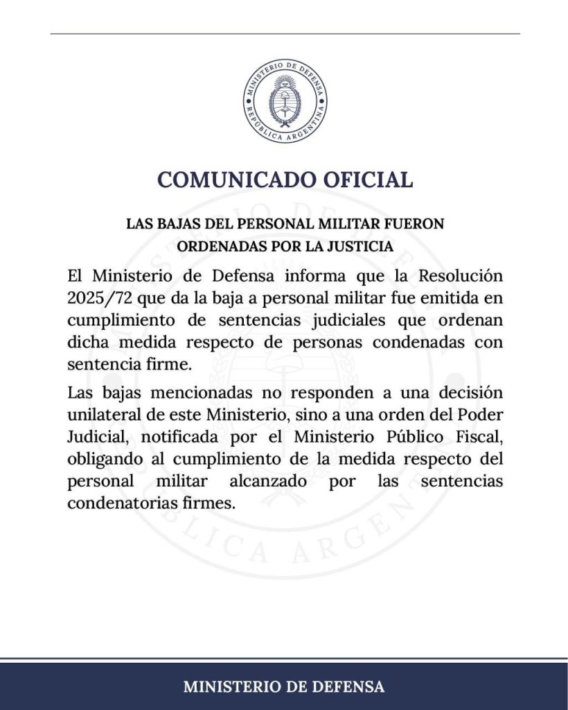 “Las bajas mencionadas no responden a una decisión unilateral de este Ministerio, sino a una orden del Poder Judicial notificada por el Ministerio Público Fiscal obligando el cumplimiento de la medida respecto al personal militar alcanzado por las sentencias condenatorias firmes” señala el comunicado que el ministerio de Defensa publicó también en sus redes.