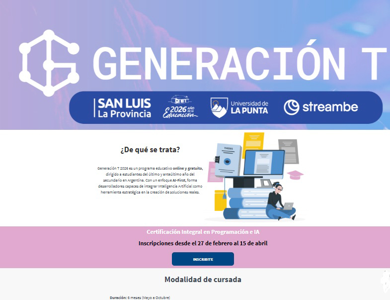 “Generación T” apunta a estudiantes del último y anteúltimo año del nivel secundario. Se trata de una propuesta desarrollada por la empresa tecnológica Streambe, centrada en la formación de desarrolladores bajo el paradigma AI-First.