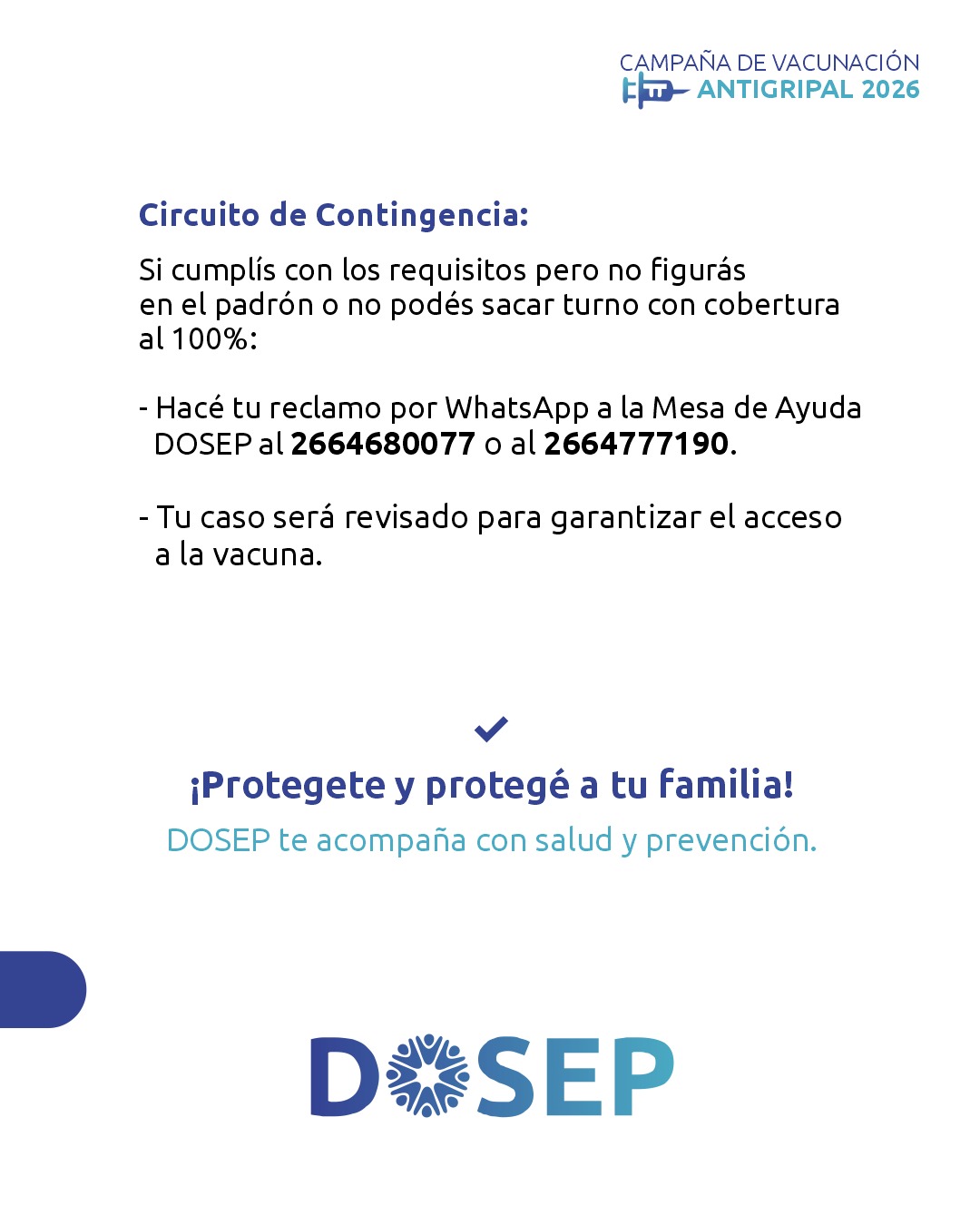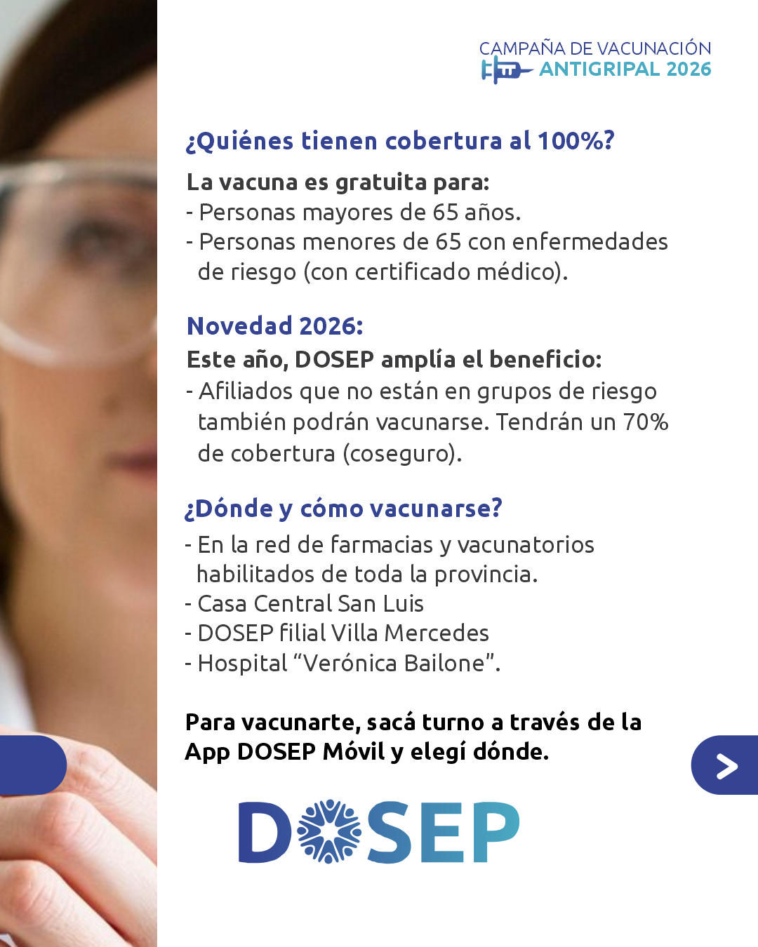 La Dirección de Obra Social del Estado Provincial (DOSEP) puso en marcha la campaña de vacunación antigripal 2026 destinada a sus afiliados, en el marco de las estrategias preventivas impulsadas por el Ministerio de Salud de San Luis de cara a la temporada invernal.