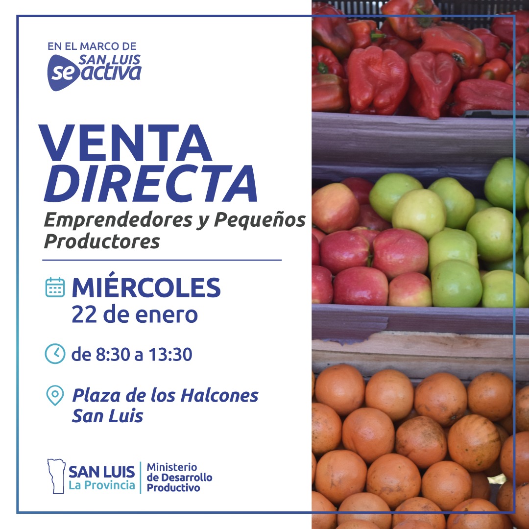 Este miércoles 22, la venta directa semanal que hacen los emprendedores vinculados al programa «San Luis se activa» se hará en la plazoleta «Halcones del cielo», en la avenida Juan Gilberto Funes de la capital puntana.