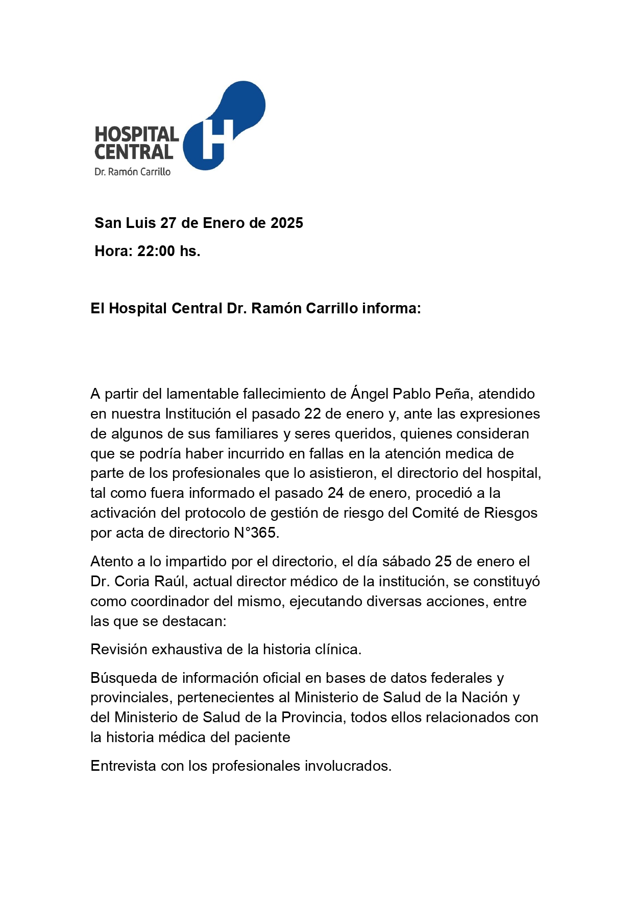 El directorio del Hospital Central «Dr. Ramón Carrillo» hizo público un informe en relación a la muerte del joven peluquero Angel Pablo Peña, cuyo fallecimiento causó dolor más allá de su círculo familiar, por tratarse de una persona reconocida en la ciudad de San Luis, pero también inquietud a partir de las denuncias públicas que responsabilizaron de su muerte al accionar médico de ese nosocomio.