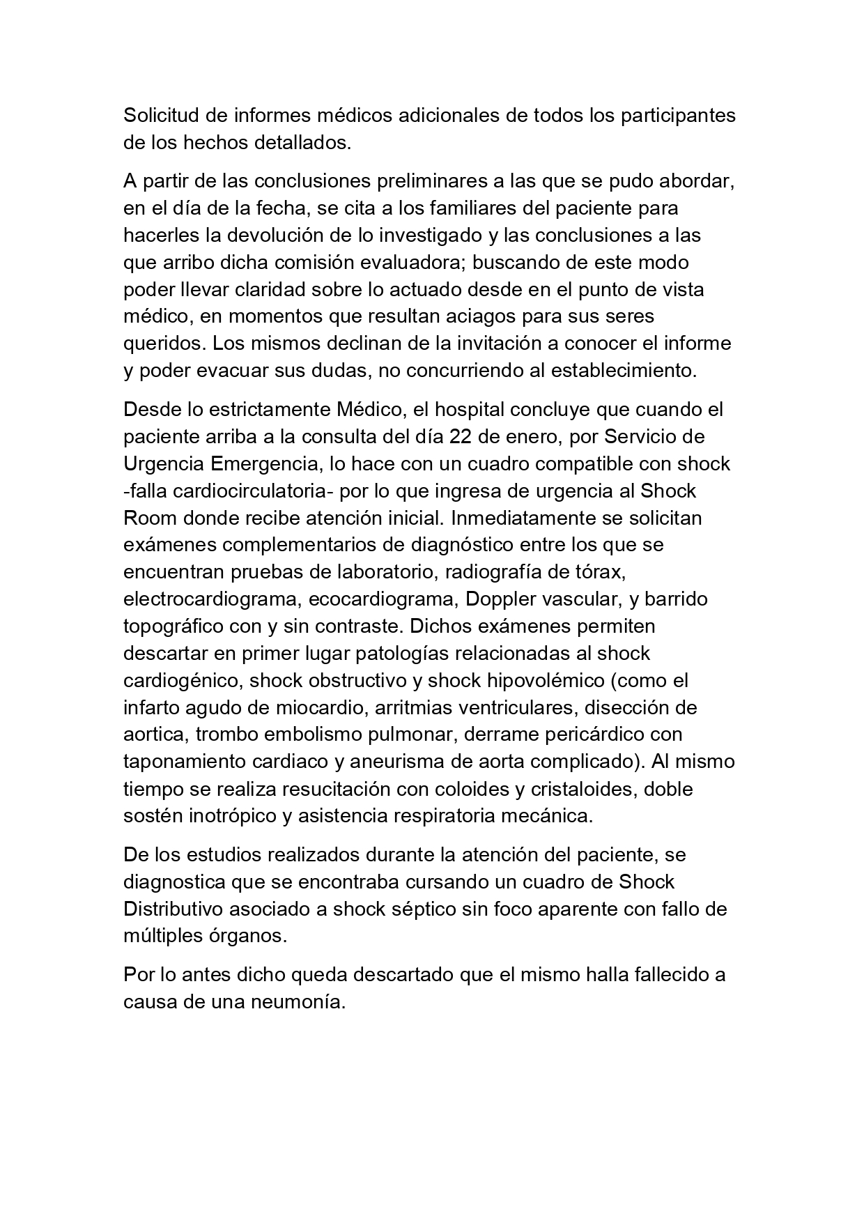 También se informa que los familiares del paciente fueron llamados «para hacerles la devolución de lo investigado y las conclusiones a las que arribo dicha comisión evaluadora; buscando de este modo poder llevar claridad sobre lo actuado desde en el punto de vista médico, en momentos que resultan aciagos para sus seres queridos. Los mismos declinan de la invitación a conocer el informe y poder evacuar sus dudas, no concurriendo al establecimiento».