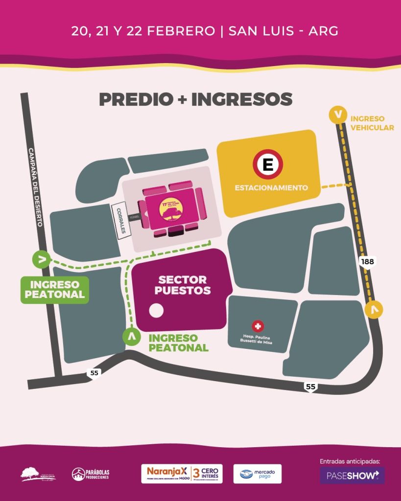 El estacionamiento se realiza por Ruta Nacional N°188, con un costo de $5000. Se permite el ingreso de mamadera, coche de bebé, encendedor, cigarrillos, equipo de mate, protector solar y botella de consumo personal. No se podrá ingresar con latas, elementos cortopunzantes, reposeras, aerosoles, perfumes, conservadoras, bebidas en botellas ni pirotecnia.