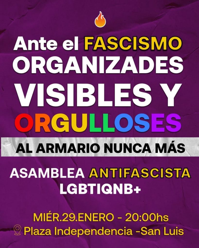 En la ciudad de San Luis, la Asamblea Antifascista LGBTIQNB+, organizada por el colectivo COMO Marcha del Orgullo San Luis, se llevará a cabo el miércoles 29 de enero a las 20:00 en Plaza Independencia.