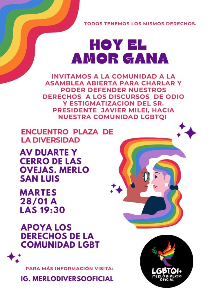 En Merlo, el colectivo Merlo Diverso convocó a una asamblea abierta que se llevará a cabo este martes 28 de enero, a las 19, en la Plaza de la Diversidad, ubicada en Avenida Duarte y Cerro de las Ovejas. Con el lema “Hoy el amor gana”, la convocatoria busca generar un espacio de diálogo y organización frente al discurso de odio del presidente y en defensa de la igualdad y los derechos humanos.