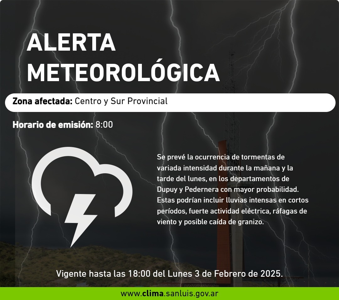 La Red de Estaciones Meterológicas (REM) emitió una alerta por tormentas que incluye al centro y sur de la provincia. Las lluvias, de intensidad variada, están previstas para la mañana y tarde de este lunes. Y llegarían acompañadas de actividad eléctrica, granizo y ráfagas de viento. El foco está puesto especialmente en los departamentos Dupuy y Pedernera.