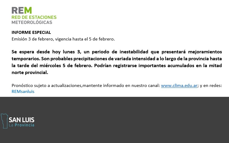 El agua del cielo caería en la provincia hasta el próximo miércoles. La REM también publicó un informe especial por “un período de inestabilidad con mejoramientos temporarios”. Advierte sobre “probables precipitaciones de variada intensidad a los largo de la provincia hasta la tarde del miércoles”.