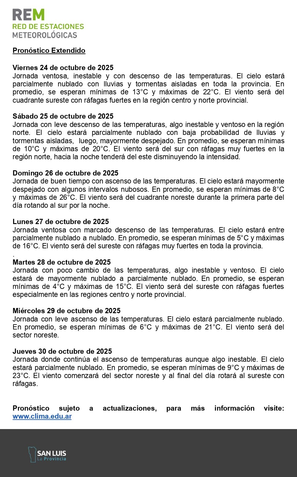 La Red de Estaciones Meteorológicas (REM) emitió una alerta para el centro y norte de la provincia. Advierte por lluvias y tormentas aisladas a partir de este jueves por la tarde, especialmente en el departamento Dupuy, Pedernera y sur de Pueyrredón. Las precipitaciones “podrían estar acompañadas por ocasional caída de granizo, actividad eléctrica y fuertes ráfagas de viento”.