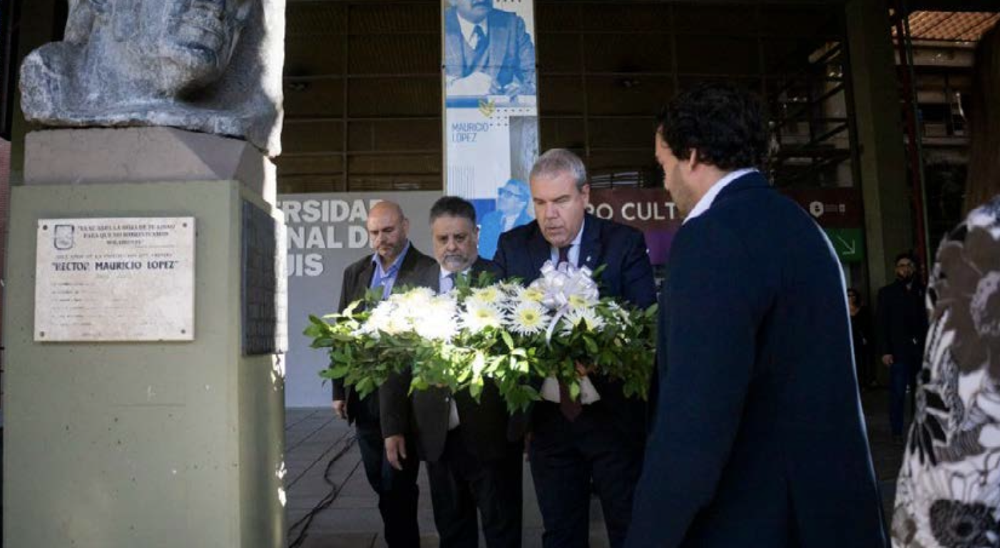 El rector de la UNSL, Víctor Moriñigo, junto a autoridades y a la representante del Centro de Estudiantes de la Escuela Normal Juan Pascual Pringles (ENJPP), Delfina Reynoso, depositaron una ofrenda floral ante el busto de Mauricio López.