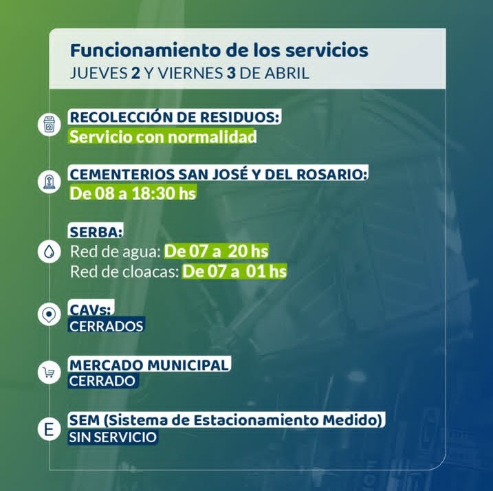La recolección de residuos será normal y los cementerios “San José” y “del Rosario” estarán abiertos de 8 a 18:30. En cuanto a SERBA, la red de agua tendrá personal de 7 a 20 y la de cloacas de 7 a 1.