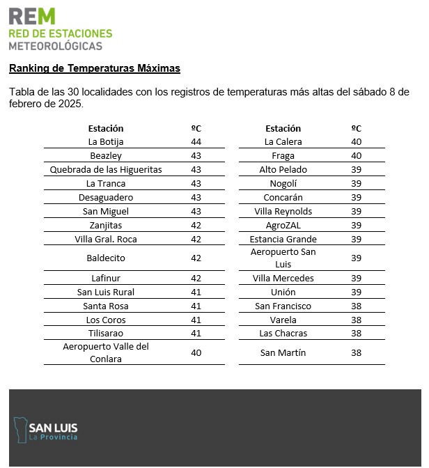 De acuerdo a la Red de Estaciones Meteorológicas (REM), desde el sábado hasta hoy a las 7, La Botija registró el pico máximo con 44 grados. Cinco localidades alcanzaron los 43 grados: Beazley, Quebrada de la Higueritas, La Tranca, Desaguadero y San Miguel.