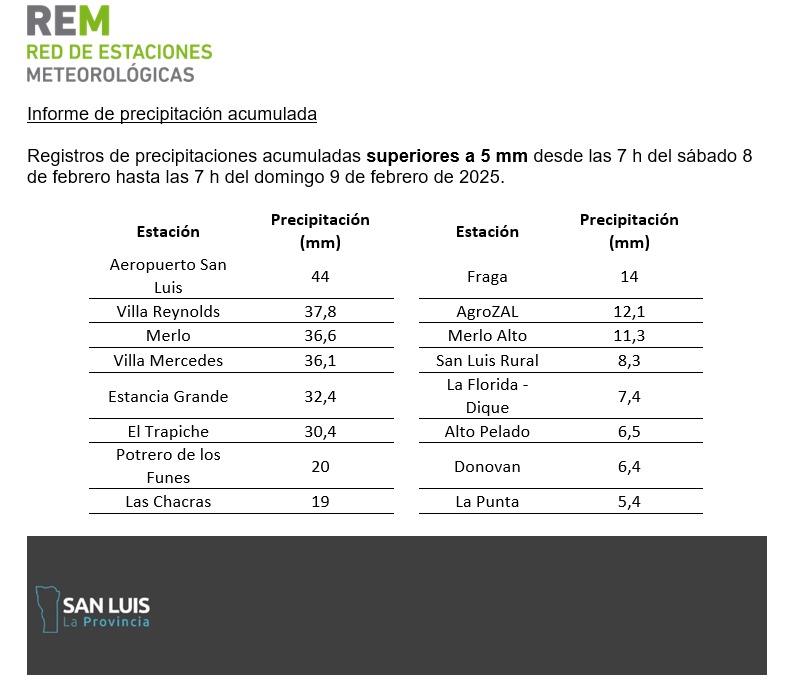 En cuanto a la tormenta que causó daños materiales a su paso, San Luis fue la localidad donde más llovió. Acumuló 44 milímetros. Villa Reynolds (37,8) y Merlo (36,6) le siguieron de cerca. Y Villa Mercedes ocupó el cuarto lugar con 36,1 milímetros.