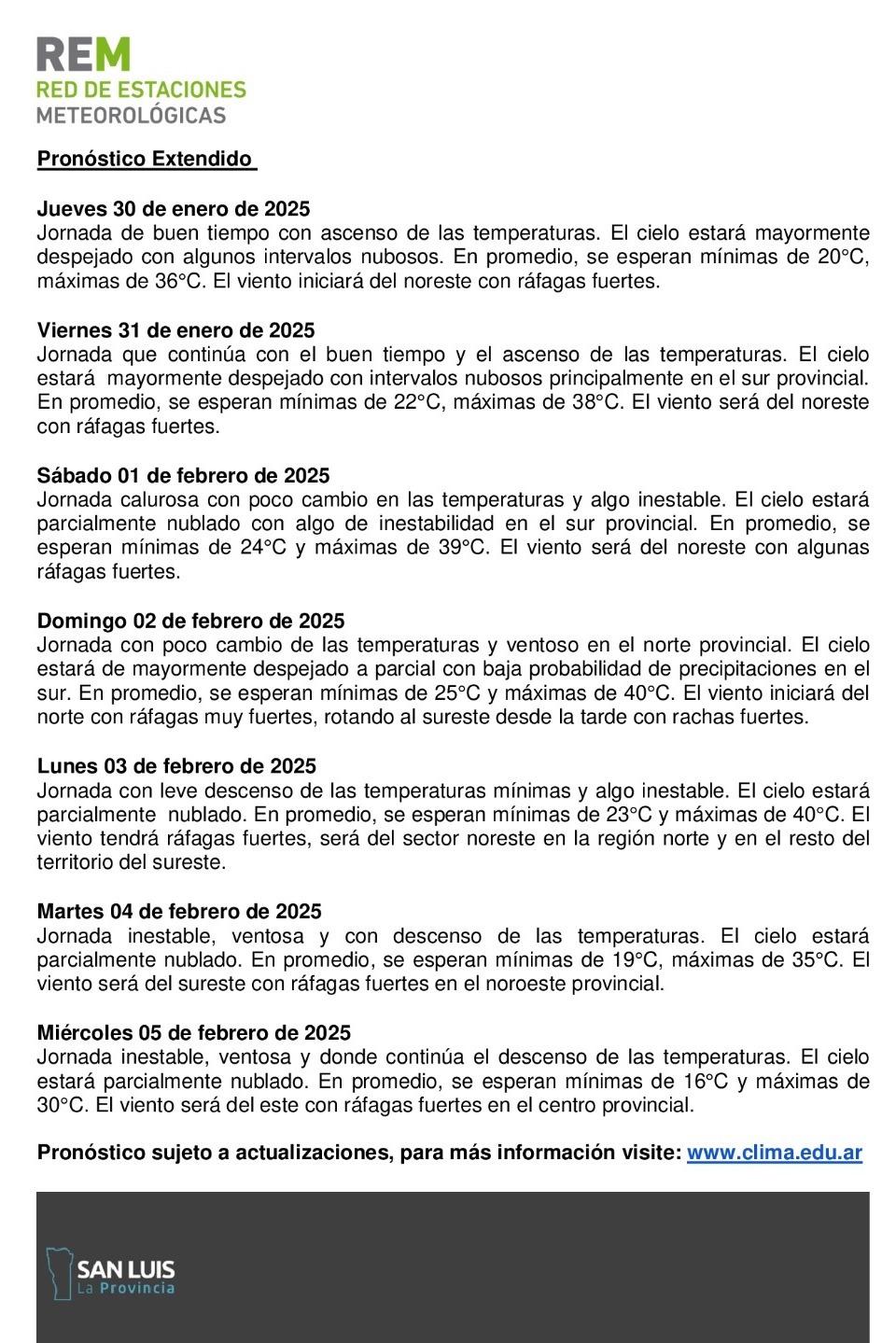Miércoles: jornada de buen tiempo y con ascenso de las temperaturas. El cielo estará mayormente despejado con intervalos ocasionales de nubosidad. En cuanto a las temperaturas, las mínimas promediarán a lo largo de la provincia los 18°C en tanto que las máximas lo harán en torno a los 34°C.