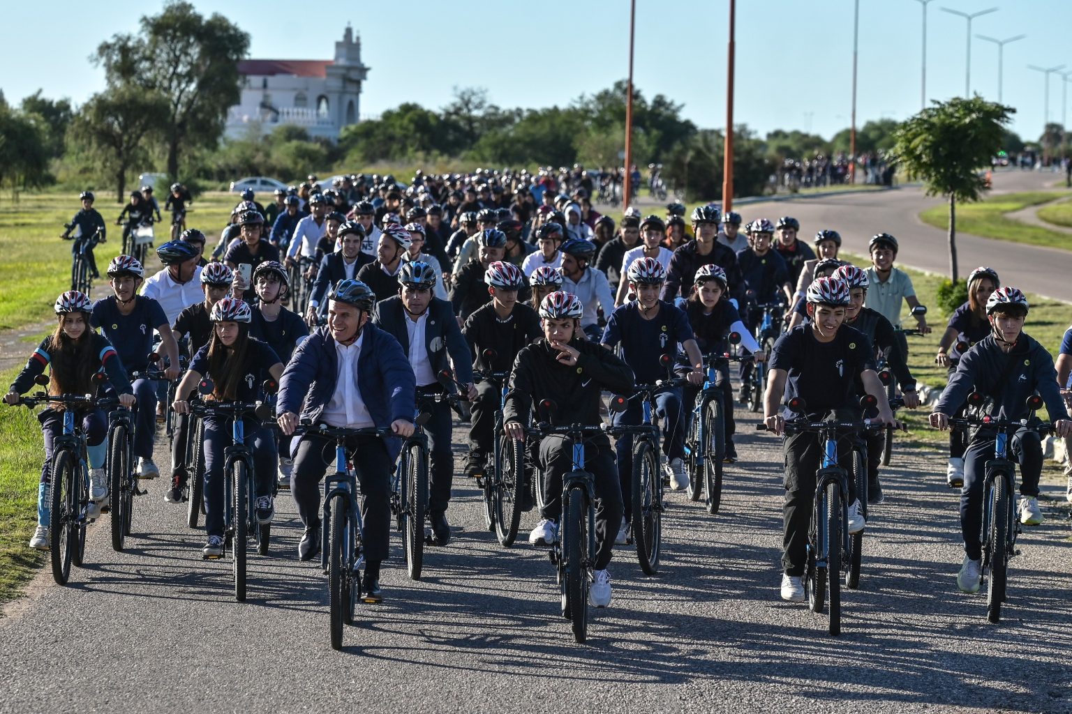 El Gobernador fue recibido por centenares de jóvenes que, entusiasmados, lo esperaban con los cascos puestos. También formaron una columna los directivos de cada institución, junto al intendente, Luciano Ayala.