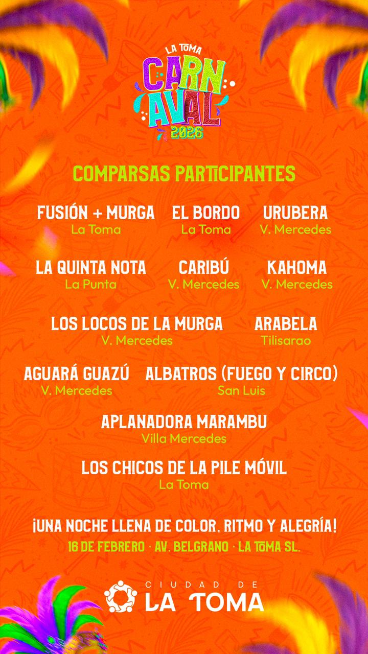 El desfile contará con comparsas y agrupaciones provenientes de distintos puntos de la provincia, lo que refuerza el carácter regional del evento. Participarán las agrupaciones de Villa Mercedes “Urubera”, “Caribú”, “Kahoma”, “Los Locos de la Murga” y “Aplanadora Marambú”; de La Punta “La Quinta Nota”; de Tilisarao “Arabela”; de San Luis “Albatros (Fuego y Circo)” y de La Toma: “Fusión + Murga”, “El Bordo”, La Toma Vieja – Mucho Ruido» y “Los Chicos de la Pile Móvil”.