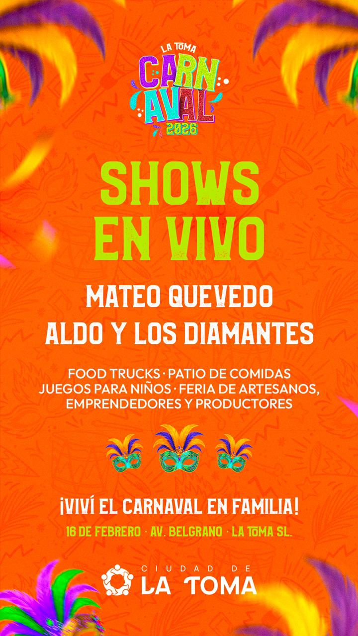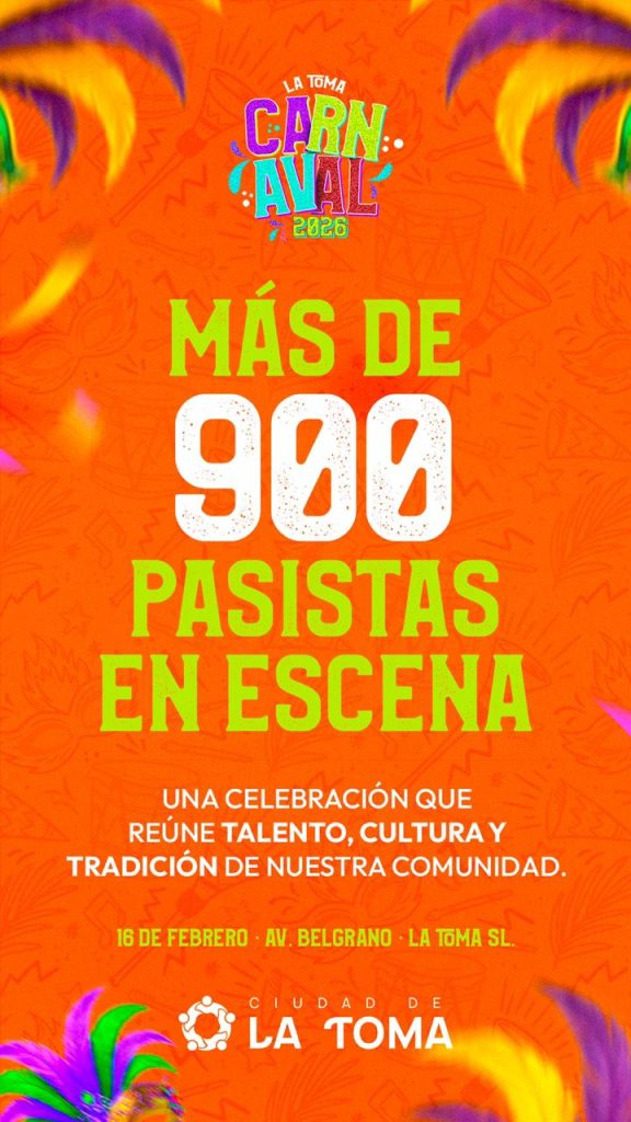 El próximo lunes 16 de febrero, la localidad de La Toma vivirá una de sus celebraciones culturales más convocantes con la realización del Carnaval 2026, una propuesta que reunirá a más de 900 artistas en escena y que promete transformar la Av. Belgrano en un escenario a cielo abierto lleno de color, danza, fiesta y tradición.