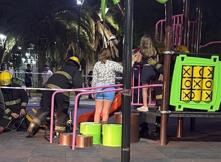 Sucedió cerca de la medianoche del jueves. A las 23:52 del miércoles, alguien se contactó con los bomberos para avisarles que necesitaban de su ayuda y sus herramientas en la plaza San Martín, porque una niña había no podía retirar una de sus piernas de uno de los juegos. Estaba atascada.