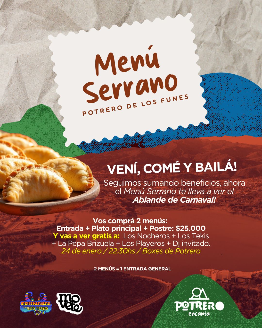 El Menú Serrano se incorpora una vez más como una alternativa que combina gastronomía local y música en vivo. Quienes adquieran dos Menú Serrano en los restaurantes adheridos accederán a una entrada general para el evento, que contará con la presentación de Los Tekis, Los Nocheros, La Pepa Brizuela, Los Playeros y DJ invitados.