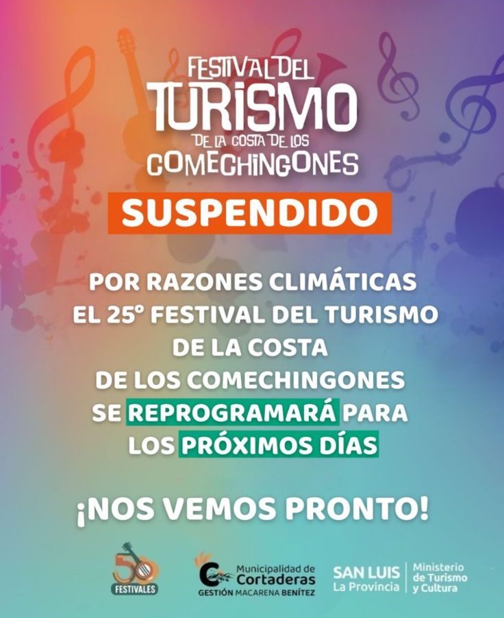 Los organizadores informaron que la edición 25° del Festival del Turismo de la Costa de los Comechingones, cuyo inicio estaba previsto para este viernes por la noche, en la localidad de Cortaderas, quedó suspendida por razones climáticas.