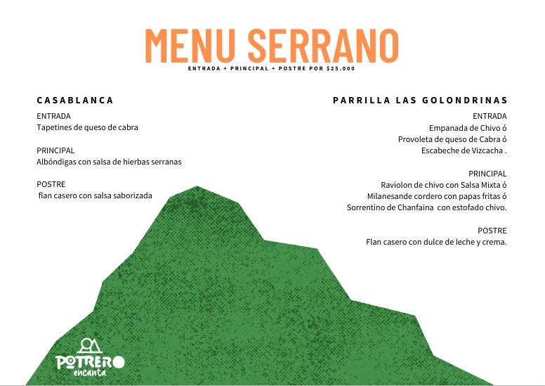 Cada uno ofrece un menú de tres pasos con distintas combinaciones, entre las que se destacan las empanadas de chivo, milanesa de cordero, raviolones rellenos de chanfaina, sorrentinos de chivo, bondiola braseada, solomillo de cerdo a la cerveza artesanal, quesillo con arrope y postres a base de algarrobo, chañar y miel serrana.