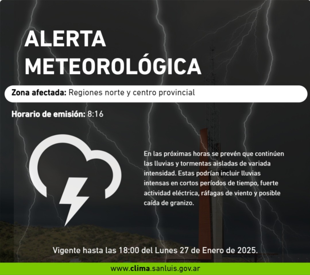 La Red de Estaciones Meteorológicas (REM) renovó este lunes la alerta por lluvias y tormentas aisladas, que podrían acumular mucha agua en poco tiempo, para el norte y centro de la provincia. Incluye ráfagas de viento fuerte, actividad eléctrica y granizo.