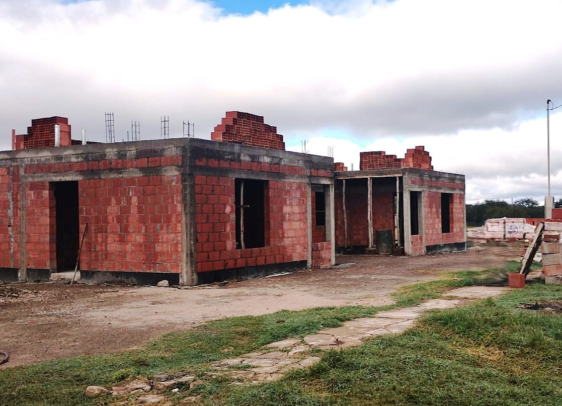 En Juan Llerena, se construyen cuatro viviendas que ya transitan la etapa de obra gruesa. Allí se realiza el levantamiento de mampostería con ladrillos cerámicos y se ejecutan columnas de hormigón armado, junto con muros portantes y divisorios que empiezan a definir los espacios interiores de las futuras casas.