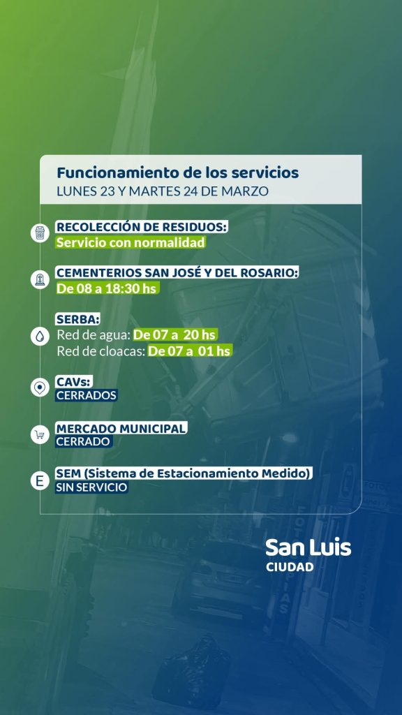 En el marco del fin de semana largo correspondiente a los feriados del lunes 23 (puente turístico) y martes 24 de marzo Día de la Memoria por la Verdad y la Justicia, la Municipalidad de la ciudad de San Luis detalló cómo funcionarán los servicios esenciales.