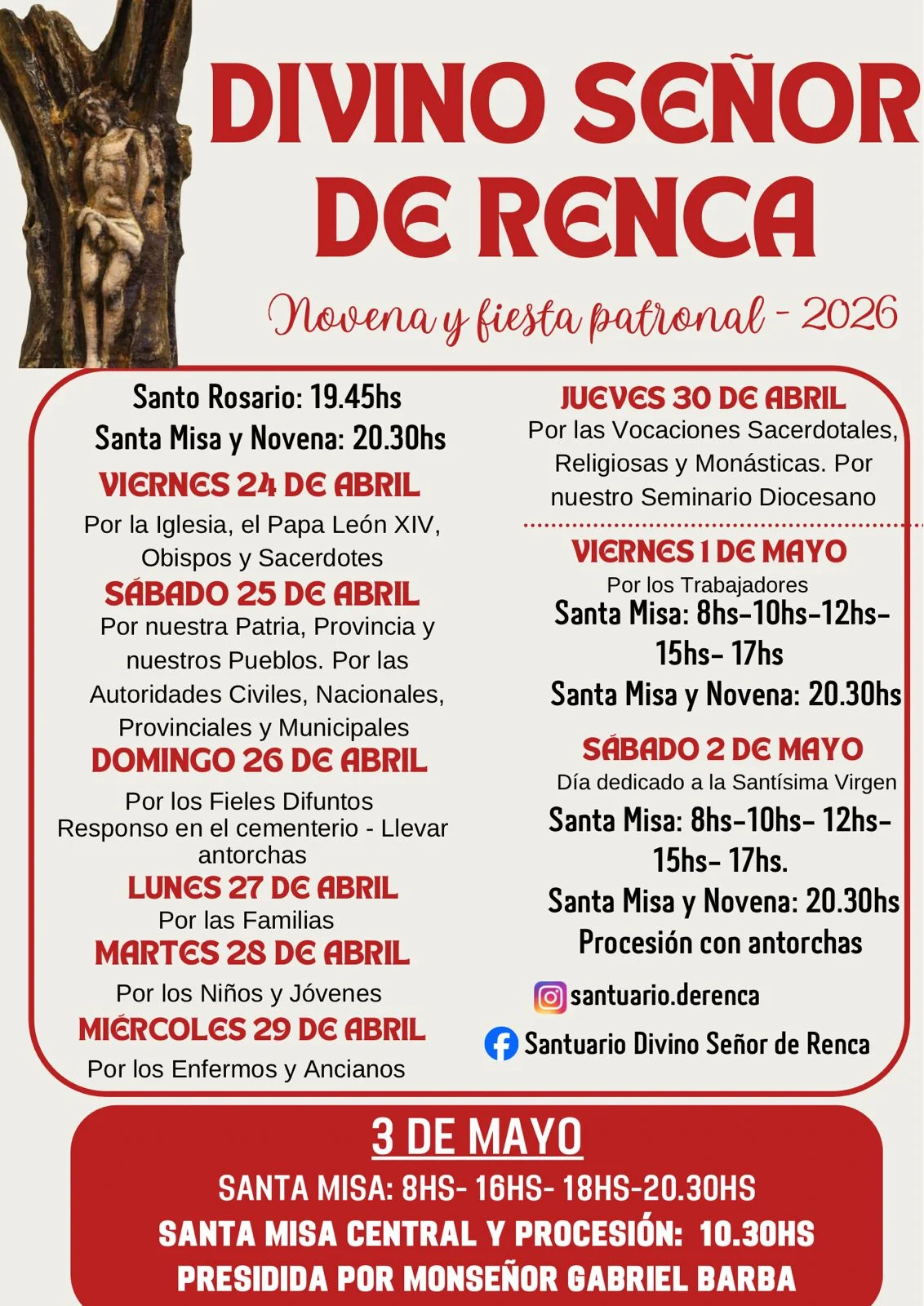 En simultáneo, la localidad de Renca vivirá su propio calendario religioso en honor al Divino Señor. Las novenas comenzarán también este 24 de abril con el rezo del rosario y misas diarias, dedicadas a distintas intenciones como la Iglesia, los jóvenes, las familias y los enfermos.